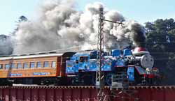 翌日は午前中から川根温泉へ。道路はかなり車が走っていたが、温泉そのものは思ったよりも空いていた。もっとも駐車場は混雑していて奥まで入って行ったのだが、遊歩道を戻ると線路に向かってカメラの三脚が林立、何事かと思ったら、休日で大井川鉄道の機関車トーマスがしかもクリスマスバージョンで走るというのを待っている人達だった。カメラ好きに鉄道好き、さらに機関車トーマスを見たい小さな子供達やドックランの犬たちまでが今か今かと鉄橋を渡ってくる機関車を待ちかねていた。もちろん我々もしっかり仲間入り。見上げるアングルなので良い写真は取れなかったが、ワクワク感は楽しめた。