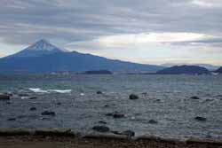 しかし、海側に出ると道の際がそのまま海で、海越えの富士山が大きく見え、気持ちの良い景色が広がった。曇り空だったのがちょっと残念だった。そして、道が狭いので気を使ったが…。