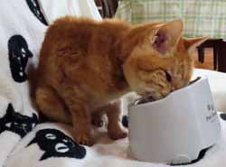 写真は今日のおやつ時。左右の前足の太さが違うのは、昨日、獣医さんで補液をしてもらったものが背中から足にまわってしまっているから。