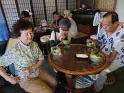 腹ごなし方々、海沿いの道をディスカバリーパークまで行って足裏刺激のコースを試し、海を見る。帰りには西町でかき氷。氷屋さんも代替わりをしていて、小学生らしい女の子も含めて若い家族が中心となっていた。クーラーなどなく、開けっ放しの店先によしず張り、ついさっきマグロをたっぷりお腹に入れたのに、これは別腹。喉も乾いていたので、あっという間にお腹に収まった。