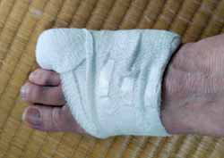 足に沿ってギプスがしっかりと整形されているので、今日からお風呂はギプスを脱いで入って良し。その代わり看護師さんによるギプスの取り方と入浴後の着け方のレクチャー。ずれないように絆創膏を巻き付けてガッチリと留めれば包帯は緩衝材と気休めのようだが、ギプスの外側が綿なので毛羽立たないように巻いておいた方が良さそうだ。ただ、今日は昨日よりしっかりと巻かれたらしく、やっと慣れたバランスが崩れてまた立ちにくくなってしまった。