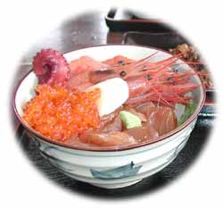灯台のすぐ前にある古くからの食堂に上がりこむ。高台なので窓の外はそのまま太平洋。穏やかな海が大きく見える。TOPPOさんが「おごるよ」っと言うのでありがたくこの店の名物らしい海鮮丼。ご飯のうえにヅケにしたマグロが積み重なり、奥には行けども行けどもエビの山、その上からこれでもかというほどの北海道直送というイクラの山。さらに数の子とタコまで乗っかってご飯は下で小さくなっている。さらに小鉢のシラス、ワカメの味噌汁と瓜の漬物、その上店のサービスのアラ煮まで付いた。いっぱいのお腹を抱えてお向かいの土産物屋さんへ。メインは貝殻という海辺の古式ゆかしいお店。かなり派手な色の貝殻も天然の色だそうだ。その貝殻を使って奥さんが細工物も作っているようだ。