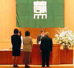 旧交を温める間もなく開会。学長・理事・校友会長の挨拶に続いて、3世代農大生だった5家族の表彰が行なわれた。