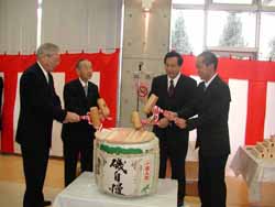 再度、学長ほかの挨拶があり、鏡割りをして乾杯。何と焼津の磯自慢の樽が来ていた。蔵元の子息が農大に入ったと聞いていたのでその関係かもしれない。ビールや農大で醸造されているライスワイン、ソフトドリンクなどを飲みながらつまみを取っておしゃべり。ここでTANUKIはようやく農大に残っている友人と多分卒業以来で会う事ができた。