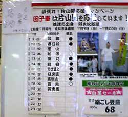 スーパーへ買い物に行ったら地元出身の十両・片山関の星取表。☆でも★でも本日のバーゲン品はあるようだが★★は…。☆で気持ちよくバーゲンと参りたいもの。本日は☆だったが明日は何が安くなるのやら。