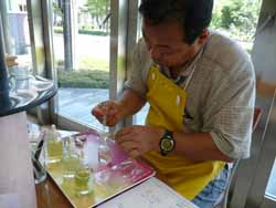 後は香りの体験コーナーで自分の香りを作る。TOPPOさんは初めてだが我々は3年前にもやっている。自分の好みのベースの香りを決めコンピーターにデーターを入れてサブの香りをいくつか組み合わせた中から自分の好みのものを作る事ができる。TANUKIは後で比べてみたら前回とまったく同じだったらしい。夏の事でもあり、皆さっぱり系の香りになった。