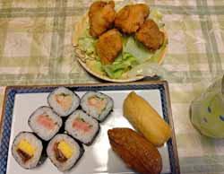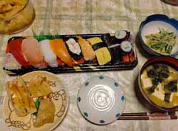 今日はTANUKIおじさん、DORAおばさんそれぞれにお出かけ。お昼にすれ違いなのでDORAおばさんはお昼を2人分用意。TANUKIおじさんはお昼前に静岡のおばさんの1周忌に出かけて、お昼のお寿司を2人分頂いてきました。という訳で、今日の主食はお昼と夜で2人のメニューが入れ替わっています。