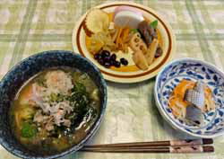 お正月は神棚の神様(伊勢神宮・焼津神社・七社神社)と金光様・お仏壇にお雑煮とお節(ちょっとずつだけどね)をお供えするので、このお下がりを食べるのがDORAおばさんだけでなくTANUKIおじさんも結構大変なってきたんだよね。