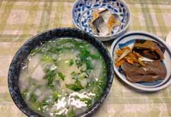 今日は七草。もちろん買い物には出られないのでありあわせの小松菜と春菊・大根・里芋…。後は残り物をかき集めて。お昼は食欲が無かったので、おやつにTANUKIおじさんが淹れたコーヒータイム。お夕飯は担々麺。TANUKIおじさんが暮れに買った挽肉もまだ山ほど冷蔵庫にあります。この時期のおかげで2人とも体調が悪くても兵糧攻めにはなりません。