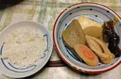 昨夜のおでんの残り(茹で卵・厚揚げ・白はんぺん・黒はんぺん・さつま揚げ・1口がんも・大根・ジャガイモ・こんにゃく・昆布)ご飯