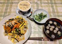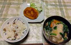 栗饅頭中華風雑煮(豚肉・卵・白菜・人参・小松菜・シイタケ・わかめ) ご飯