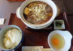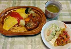 干支饅頭オムライス(昨夜のハヤシルーの残り・卵) うどんすき(牛肉・焼き豆腐・白菜・春菊・牛蒡・しめじ・うどん・餅)