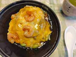 おさんこち無し 卵とじ天丼(昨夜のエビ天の残り・蒲鉾・玉ねぎ・煮しめの人参とサヤ)