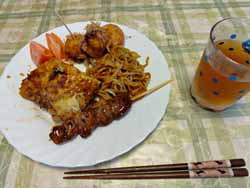 お昼はスーパーの粉物3連荘。お好み焼き・焼きそば・たこ焼き!タンパク質不足に焼き鳥プラス。半夏生でタコを食べたかったけど高かったから、たこ焼きにしたんだって。