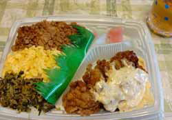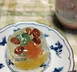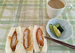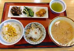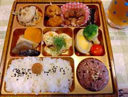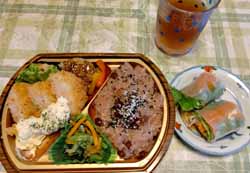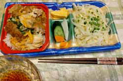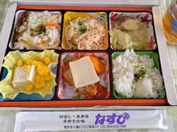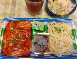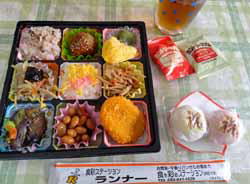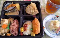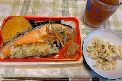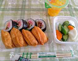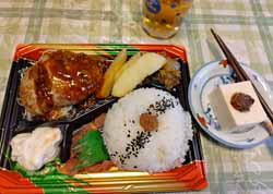 DORAおばさんのお昼はけやきの会のお弁当。暑くなってきたのでかなり味付けが濃くなっています。味が濃すぎて食べきれず、TANUKIおじさんが1こずつお味見。実はお漬物もゼリーもまだ食べていません。