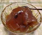 しばらく前、TANUKIおじさんが豚バラを塩まぶしにして下味に漬け込んで、水にさらして塩抜きをして、それをまた寝かせて、燻製にするはずだったのが失敗して煮込んだバラ肉、しっかりと味と焦げがついて仕上がりました。「出来たものは食べなきゃ」とDORAおばさん。保存食にはならず無くなりそうです。