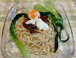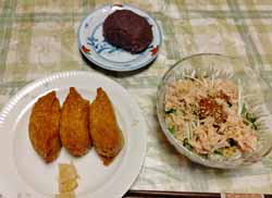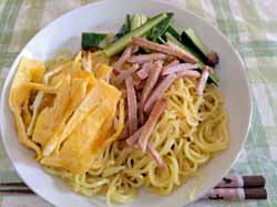 栗饅頭冷やし中華(昨夜の豚肉の残り・卵・キュウリ)焼き海苔