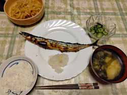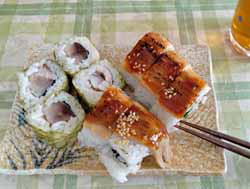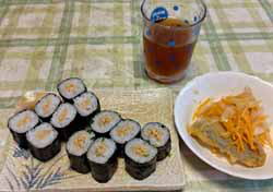 お昼は納豆巻きとツナマヨ巻き、アジの南蛮漬けとね。猫むきじゃなくて残念…。