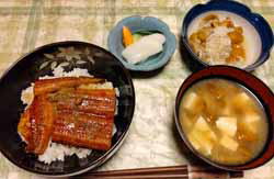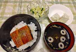 TANUKIおじさんが猫用のマグロは切ってくれたよ。人間は買ってきた出汁巻き卵…。