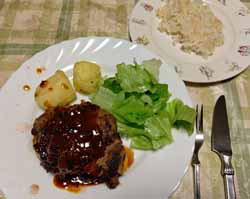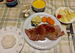 お夕飯はTANUKIおじさんがハンバーグを作りました。さすがに超巨大サイズはやめたみたい…。