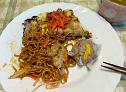 お昼はお好み焼きと焼きそばとジャンボシュウマイ…。品行方正なご飯に飽きたみたい。