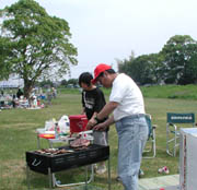 駐車場もまわりの道も車だらけ、芝生の上は何組ものグループがテントを張ったりゴザを広げたりして集まっている。