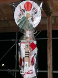 「お義姉さんも上がってみて」と皆に言われて階段を上がって2Fへ。屋根の上ではなくてここでお神酒・洗米・塩・餅を供えて拍手を打ち、4隅から餅を投げ、4隅の柱にお神酒をかけてめでたく終了。