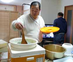 中老会が夜宮で出すお汁粉用の餅2臼と棟上式用に紅白で半臼ずつ。お汁粉用の2枚をとりあえず伸した後で、蒸米を半分餅つき機に入れて搗く。予備も入れて15個を丸めて、残りで四方餅用の大きい丸餅4つを取る。残り半分は搗く時に赤の食紅を入れて赤くする。ああだこうだと言っている間に搗きすぎじゃない?という状態になったが、丸めるとかえってきれいな肌目になった。