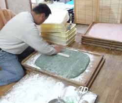 白・黄色(梔子)・ピンク(食紅)・緑(ヨモギ)を各2臼。搗く手間は機械なので良いのだが、火力が電気になって蒸しあがるまでがいささか手持ち無沙汰。以前のように広い所に広げておくということも出来ないので、伸したはしからマーミが配達先別に大きく切り分けてしまった。
