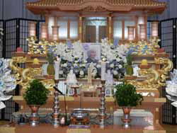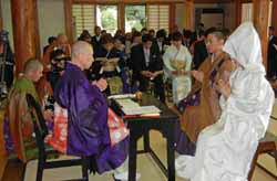 お相手がお寺の息子さんなので結婚式も仏前。東叡山泉福寺の住職様の戒師(司式)で行われた。作法が分からない人のために式の前に進行役のお坊さんが式次第に沿っての説明をしてくれた。祝詞や賛美歌が入る所が経文になったようなものだが、結婚指輪の交換の前にお数珠がそれぞれに渡された。