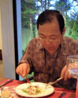 昔は食道楽で大食漢だったTANUKIもコース料理で「腹一杯だ」と言うようになった。しかし、早食い競争が得意種目のTANUKI・DORA・TOPPOの三人組、さっさと食べて廻ってくる1口のパンをヒョイヒョイと食べ、満腹になるのも早いはず。