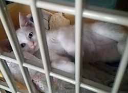 以前は犬だらけだった天王寺、ネコのミケちゃんの後、白猫のラッキーちゃんが加わったそう。まだミケにいじめられるのでケージの中に入っているようす。
