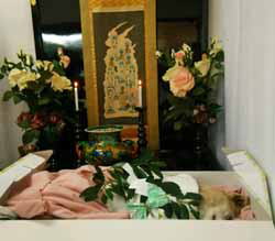 ところで、何故かお葬式は仏教式、テープだけどお経まで流れたそうだ。お棺の上は榊なのだが、お犬様のお葬式も大事になったようだ。