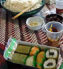 彼女が出勤し、朝食の後かたずけをしているとお昼を一緒に食べようと言っていた田原本の従妹がお昼ご飯の大荷物とともに登場。素麺と素麺汁、具材の薄焼き卵やシイタケの甘煮、刻みネギ、根ショウガまで持ってきていた。あっという間に素麺を茹でてお寿司と共に食卓へ。さっき朝ご飯を食べたばかりだがそのままお昼。話題が業界の話になったのであまりついていけないが、狭い世界なので「そうなっていたの」という話もちらほら。親戚の話も出て、先日生まれた連島の赤ちゃんはママの体調は問題がないものの赤ちゃんは体重は十分だったが、しばらく保育器で様子を見なければならないそうだ。