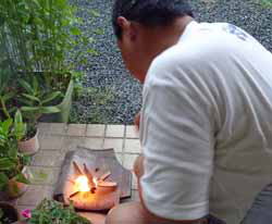今年は母の初盆という事でTANUKIがさっそく迎え火をたいた。雨だったので玄関先でささやかにだが…。